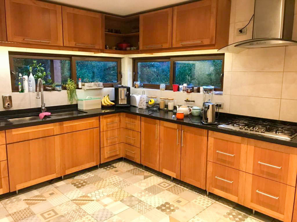Baños y cocina recubrimiento de porcelanato, grifería roca.